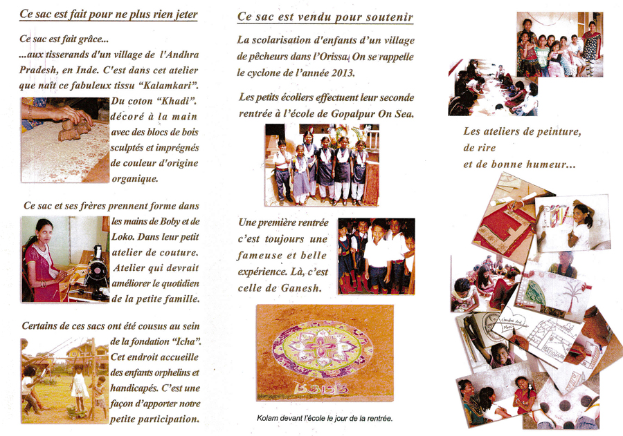 Si vous aussi vous souhaitez nous soutenir dans la scolarisation d'enfants d'un village de pêcheur dans l'Orissa. Ces petits sacs sont vendus au profit de notre association "Les Ateliers de l'Orissa" : Contactez nous ici