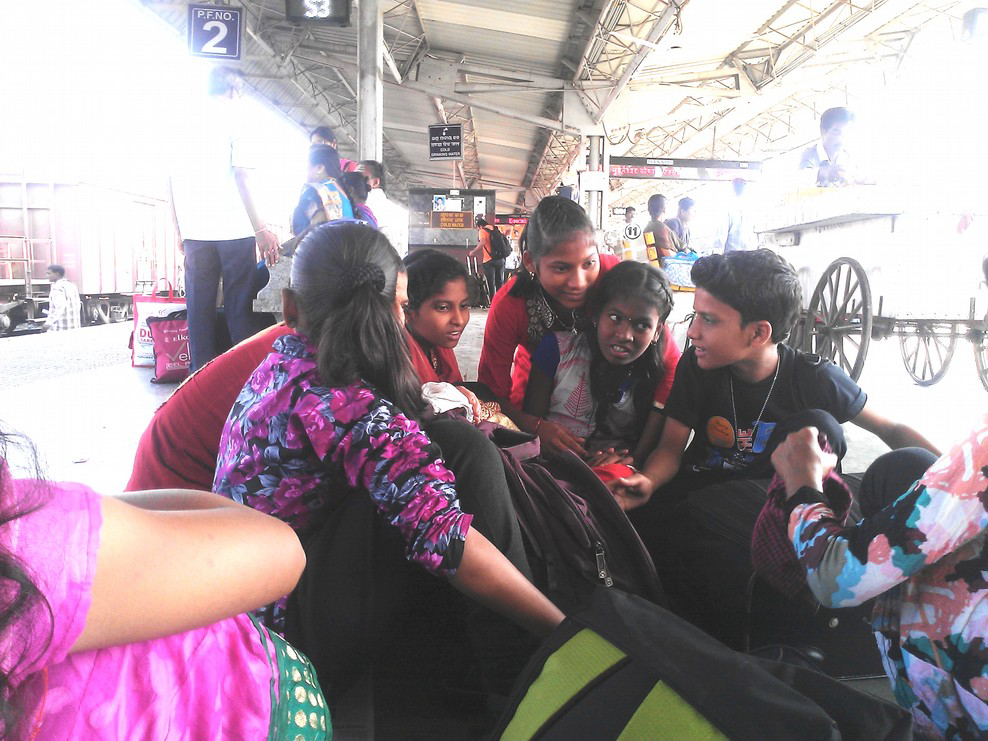 Nous avons rendez-vous devant la maison de Waneshree, à 6h30 sommes tous à l’heure, dans un état d’excitation, les deux autorickshaws arrivent, direction la gare…train à 8h05. La bonne nouvelle en arrivant sur le quai de gare, train retardé, d’une heure puis d’une autre, donc départ 10h45. Nous avons le temps de trouver le temps long, quand on attend assis sur le quai d’une gare.