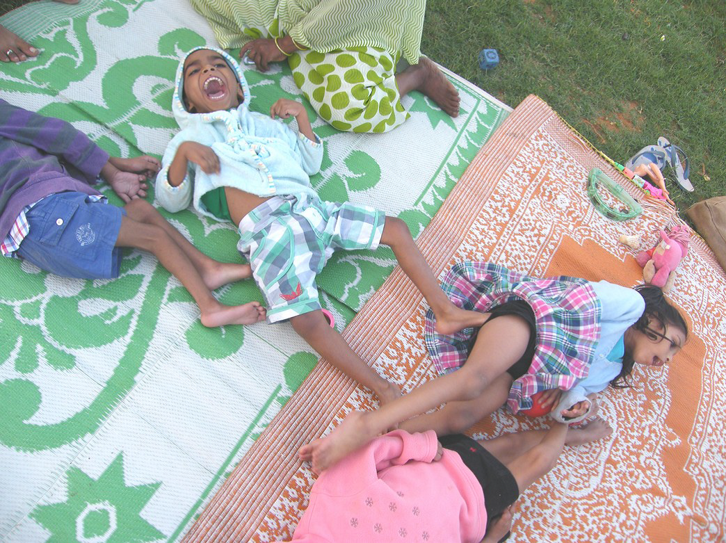 Ils se précipitent pour embrasser et prendre dans leurs bras les enfants. Madhu nous accueille et nous dirige vers le cottage réservé à la physiothérapie. Les enfants pourront y être logés avec Anita et Loko. J’ouvre une parenthèse : (Rama Krishna le physiothérapeute fait un travail extraordinaire depuis quelques années. Les séances de physiothérapie journalières et sa persévérance sont récompensées par les belles progressions des enfants.) Je ferme la parenthèse. La parenthèse est une excuse, c'est juste pour attirer votre attention.