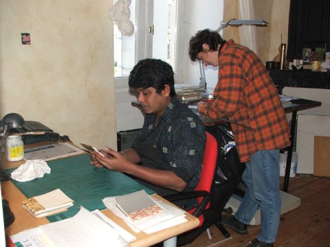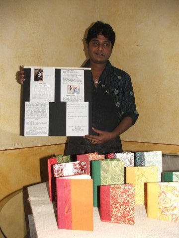 Un atelier de papier recyclé est en préparation. C'est un projet qui va donner l'occasion de mettre à contribution la population locale des villages avoisinant ICHA. Ils participeront en collectant le papier usager. Cette approche nous donnera l'occasion de les sensibiliser à la gestion des ordures. Ce papier recyclé va contribuer à mettre en pratique sur le terrain les connaissances que Loko a acquises en France. Il va transmettre aux enfants les techniques pour réaliser des livres et des cahiers qui seront utilisés à l'école. Nous allons pousser l'expérience à la réalisation du papier marbré à la cuve. Le défi est d'utiliser des couleurs naturelles issues de végétaux. Ces couleurs sont utilisées pour réaliser le Kalamkari (tissu peint à la main avec des couleurs naturelles).