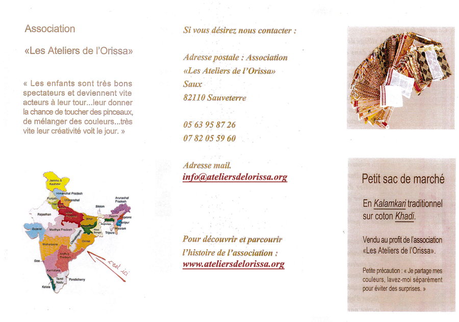 Si vous aussi vous souhaitez nous soutenir dans la scolarisation d'enfants d'un village de pêcheur dans l'Orissa. Ces petits sacs sont vendus au profit de notre association "Les Ateliers de l'Orissa" : Contactez nous ici
